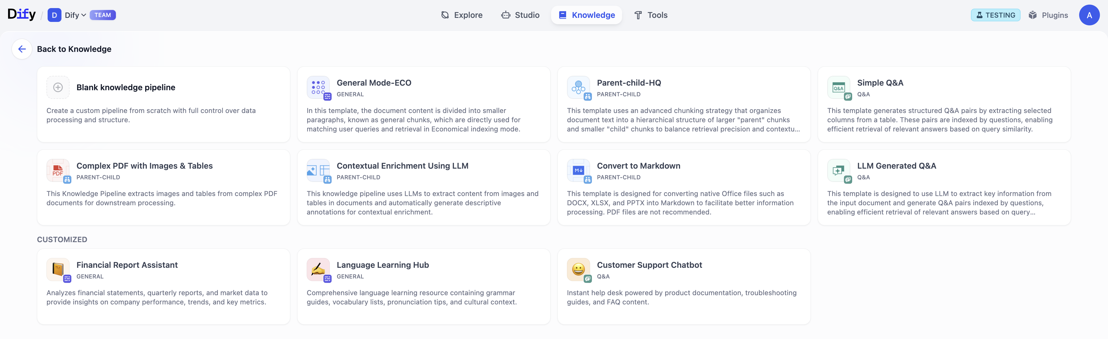 Difyは2種類のテンプレートを提供しています:内部パイプラインとカスタマイズ済み。どちらもカード上にナレッジベース名、説明、タグ(チャンキング構造など)が表示されます。